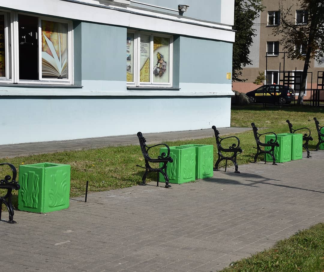 Скамейки возле Слуцкой районной центральной библиотеки покрасили разными цветами, а потом снова сняли с них доски. Как оказалось, чтобы разрисовать их в стиле книжных полок.