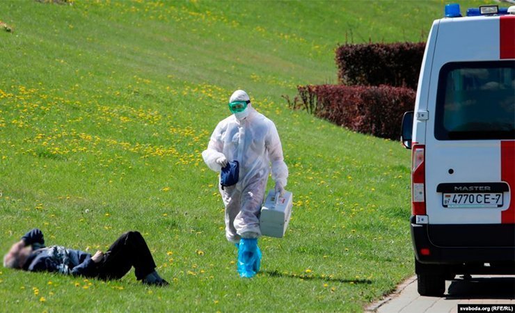 Сегодня, во время репетиции парада возле стелы «Минск — город герой» медики в противочумных костюмах забрали человека.