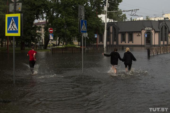 На перекрестке Гоголя и Карла Маркса вода залила дорогу и тротуары. Троллейбусы и легковушки останавливались на обочине, ожидая, пока уровень воды спадет. Брестчане воспользовались моментом и устроили стихийные купания.